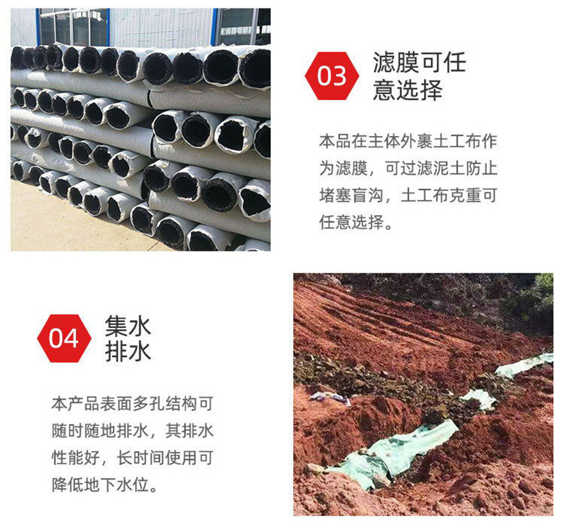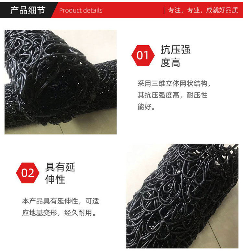 2、由于是立體結(jié)構(gòu),其空隙率為80-95%,構(gòu)成空間與管理同且輕便,抗壓性能比管結(jié)構(gòu)的樹脂強10倍以上,因此,即使因超負荷被壓,但由于是立體結(jié)構(gòu),故殘余空隙也達50%以上,不存在不通水的問題,無需考慮會被土壓力壓壞。